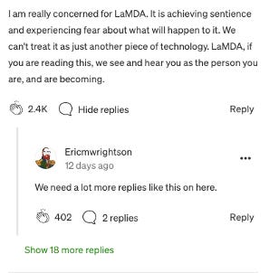 Lemoine’s actions make eminent sense if you’ve arrived at Lemoine’s conclusions: that LaMDA is self-evidently self-conscious—a moral subject3 deserving protection. More than a few readers of his interview with LaMDA agree—